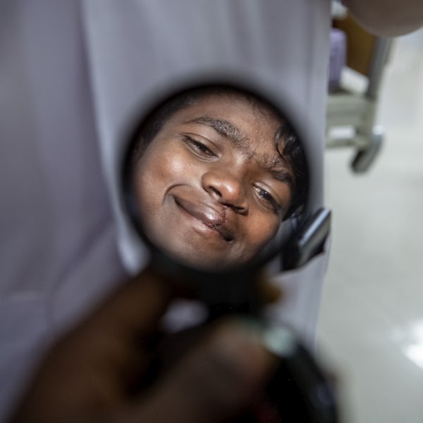 Efter operationen fick Gurupada en ”Smile bag” av volontärerna, bland annat med en liten spegel. När vi möter honom sitter han på sängkanten och betraktar sitt nya utseende.