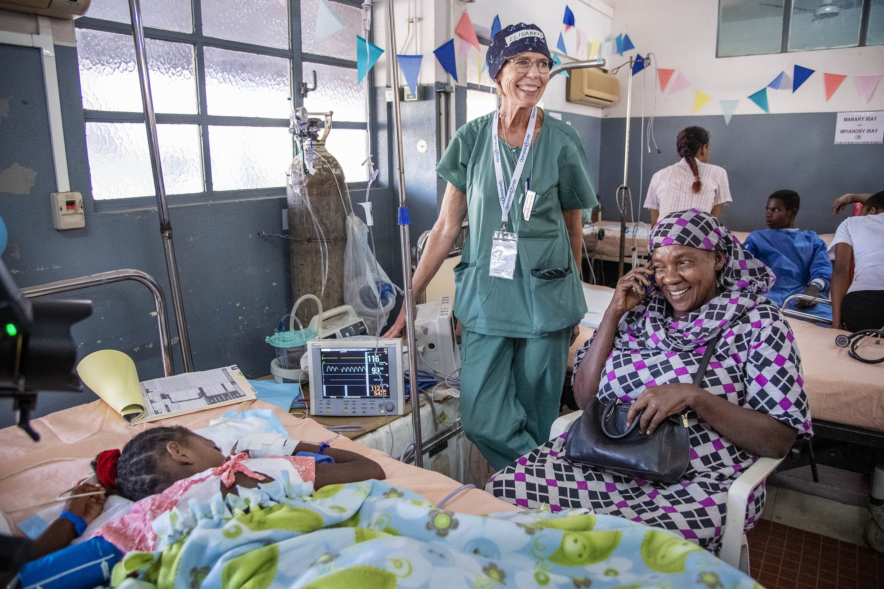 ”Snart är du hemma igen och alla kommer att se hur fin du är.” På uppvaket pratar mormor lugnande med Imany samtidigt som den svenska volontären och sjuksköterskan Elisabeth Johansson håller koll. Foto: Rohanna Mertens