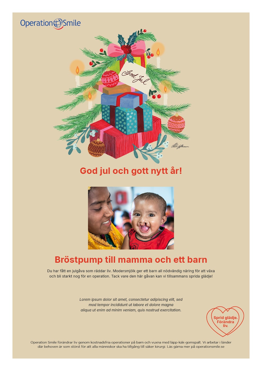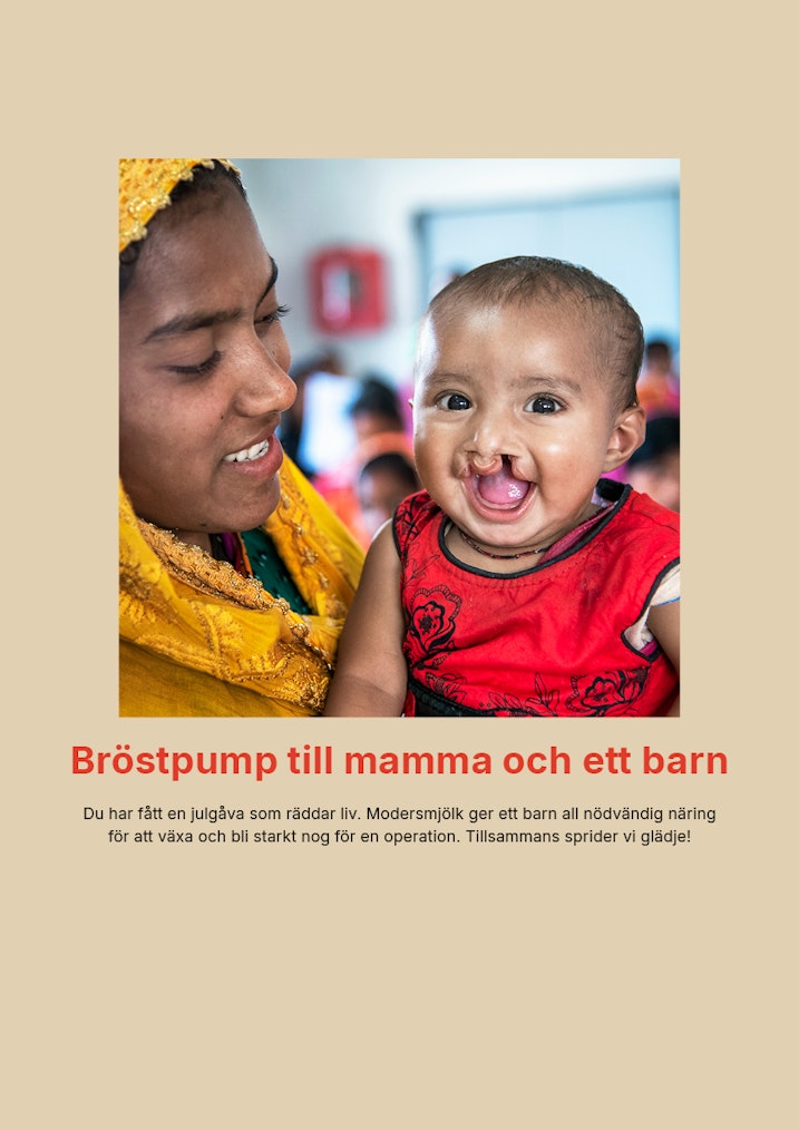 Barn med gomspalt riskerar att bli undernärda då de ofta har svårt att få i sig näring. En bröstpump kan rädda liv. Ge en livsviktig gåva och få ett fint gåvobevis att ge bort i jul.