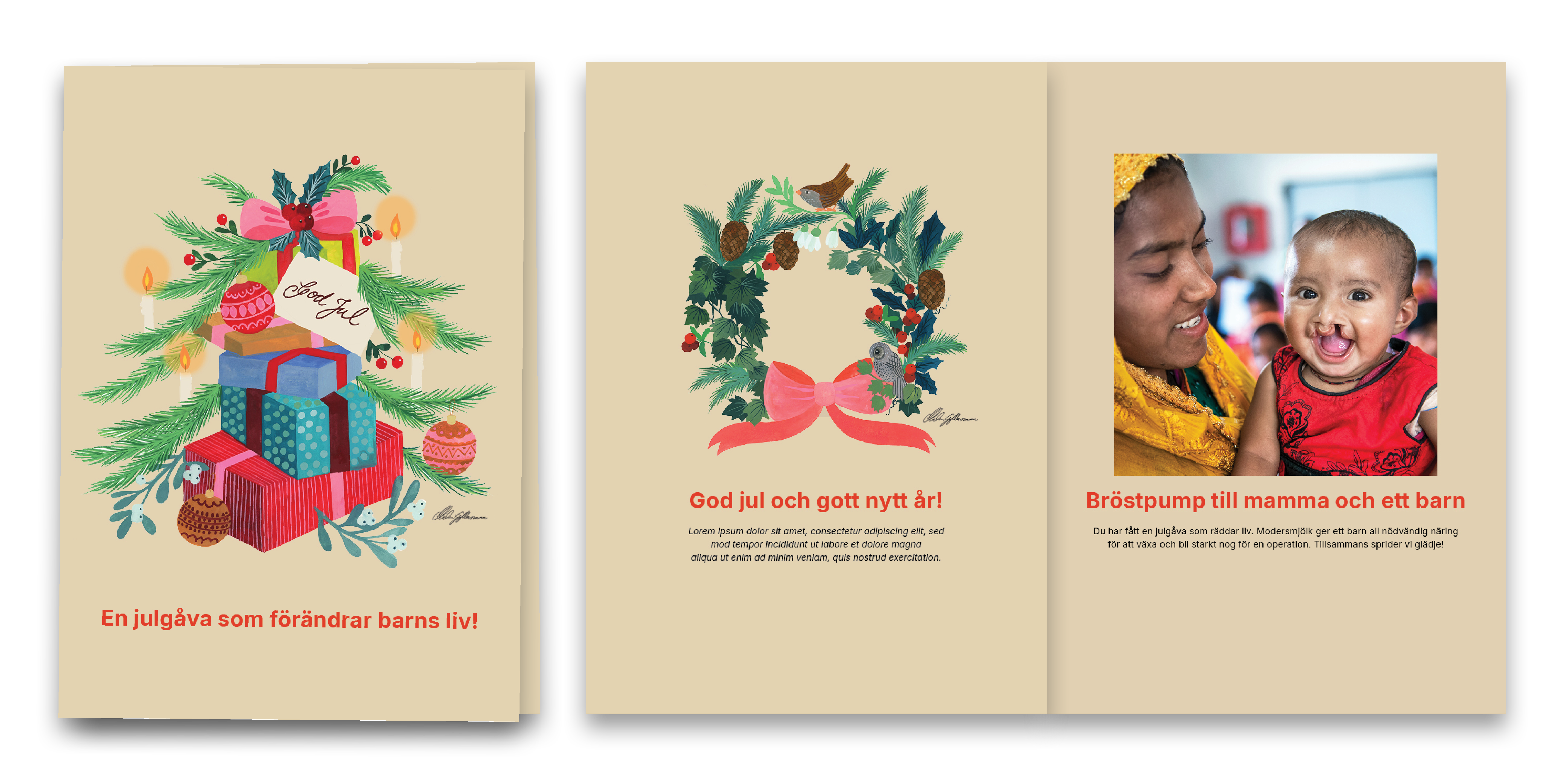 Ett vikt julkort med kuvert. Beställ ditt tryckta gåvobevis senast den 16 december om du vill hinna få det före jul. Första möjliga leveransdag för tryckta gåvobevis är den 17 november.