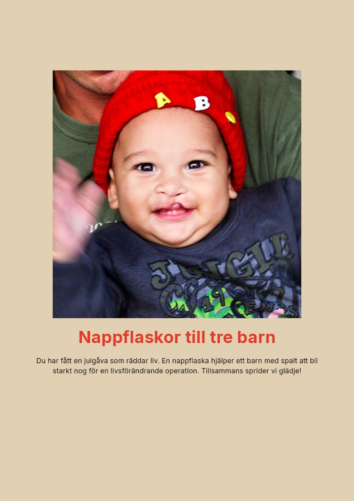 Barn med gomspalt riskerar att bli undernärda då de ofta har svårt att få i sig näring. Men det finns nappflaskor som underlättar för barnet att dricka. Ge en julgåva som hjälper barnen att växa sig starka nog för en operation.