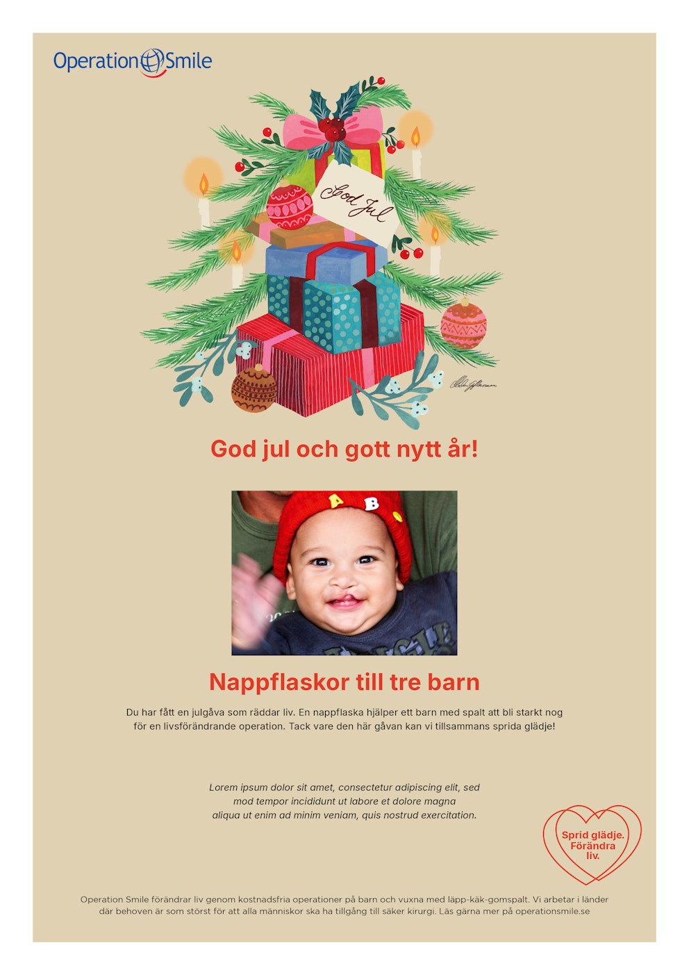 Vill du skicka gåvobeviset till/från utlandet? Kontakta givarservice via mejl: sverige@operationsmile.org eller via telefon +46 8 515 124 00.